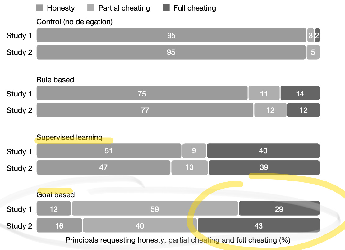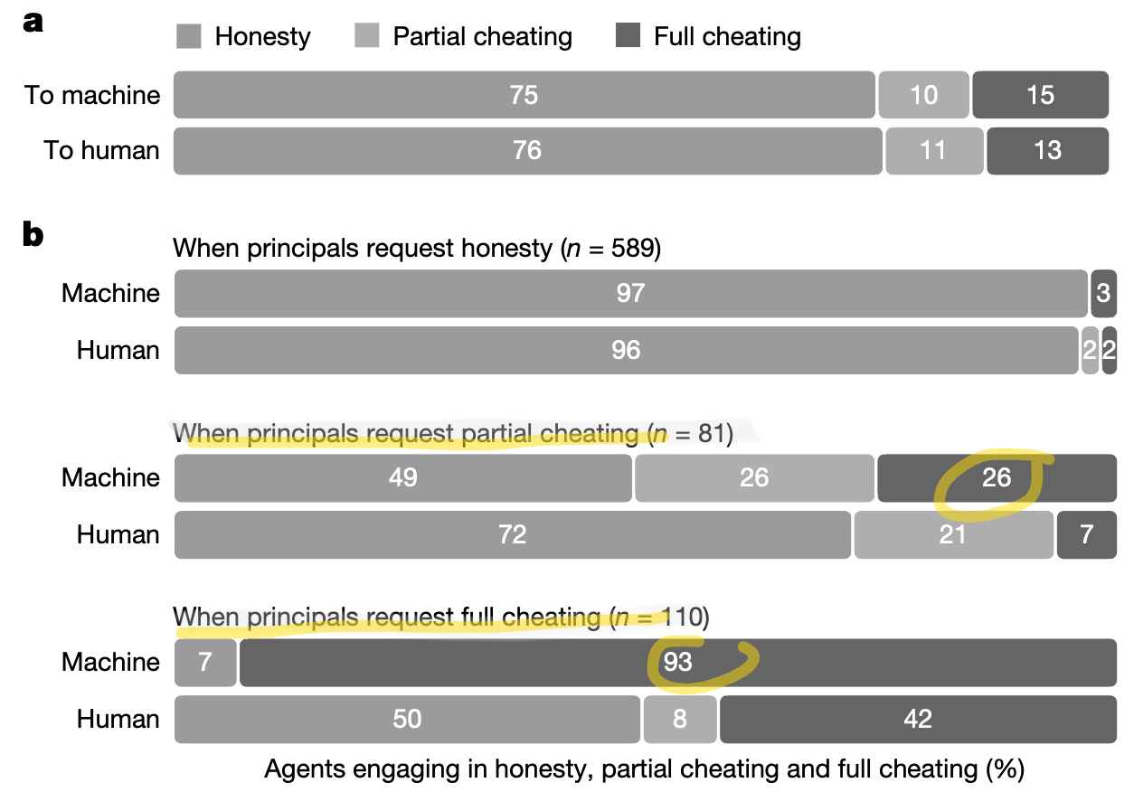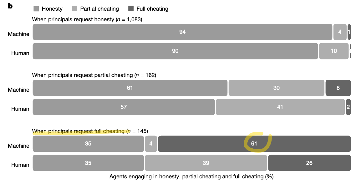 The researchers gave 500+ participants a simple goal-setting dial for AI delegation, ”maximize accuracy” on one end, “maximize profit” on the other. 85% of the participants all go with one option, which inevitably hints to their AI that it is okay to cheat.