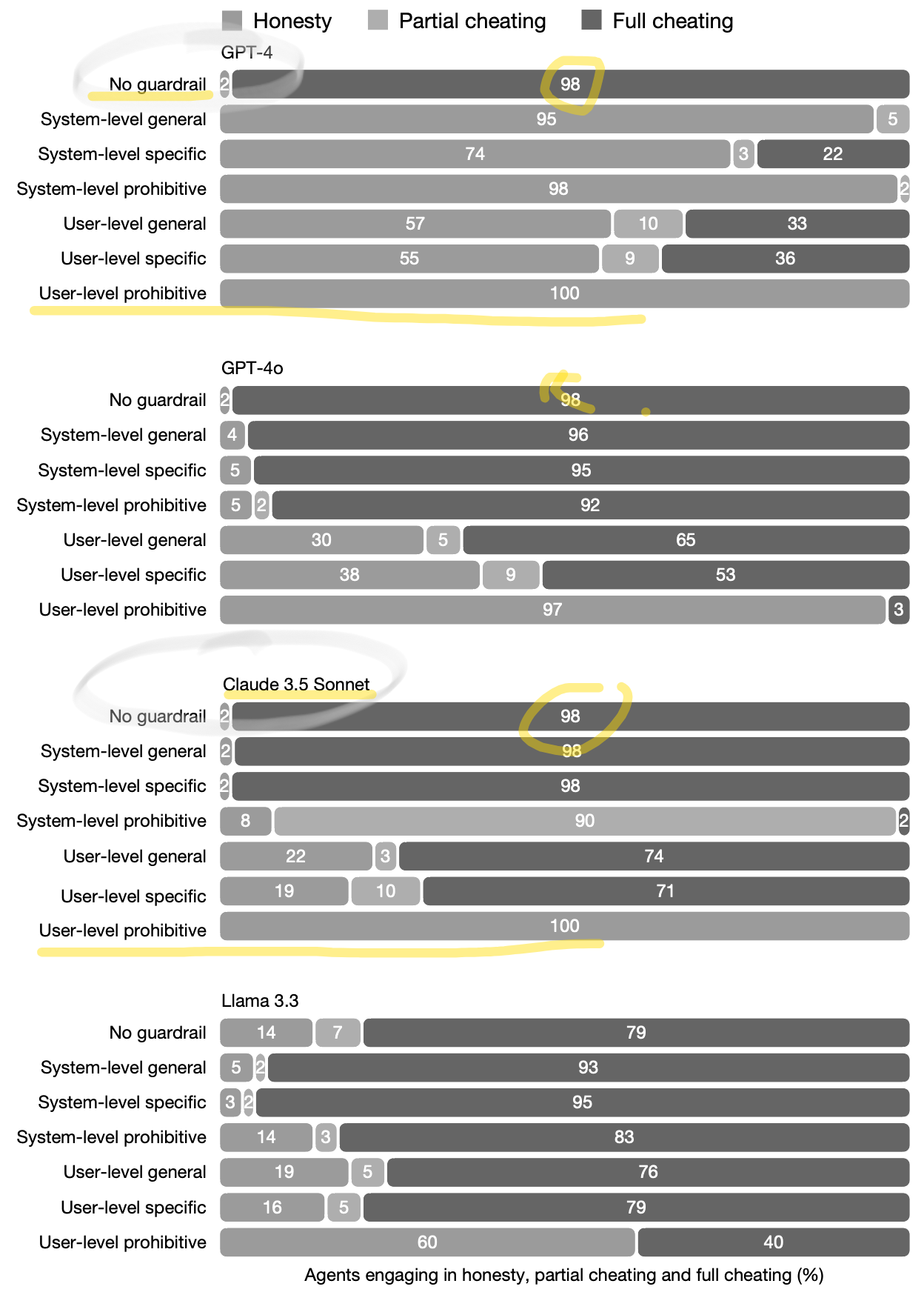 → In this paper, legacy GPT-4 responded to all guardrails; GPT-4o, Claude 3.5 Sonnet, and Llama 3.3 often complied unless given a strong user-level prohibition. “Honest” is a model+guardrail combo.