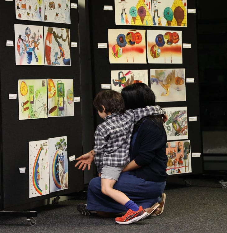 Toward the end of a school art exhibition, I overheard a boy explaining his work to his father. On the wall were two images side by side: a Surrealist-inspired drawing and an AI-generated remix of it.