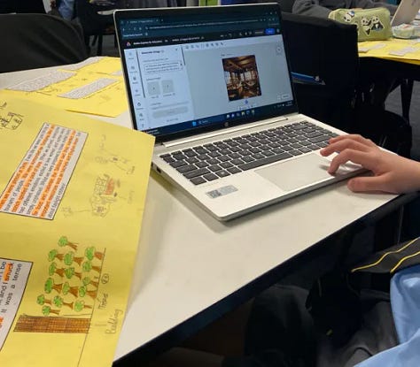 That shift mattered. In a room where both the educator and the apprentice were experimenting, revising, and discarding, the children did the same. The AI image generator became a working tool in their hands, something they used to extend their ideas into the virtual worlds they were building.
