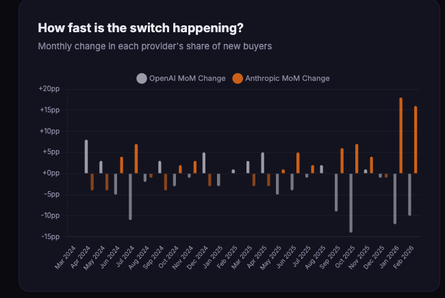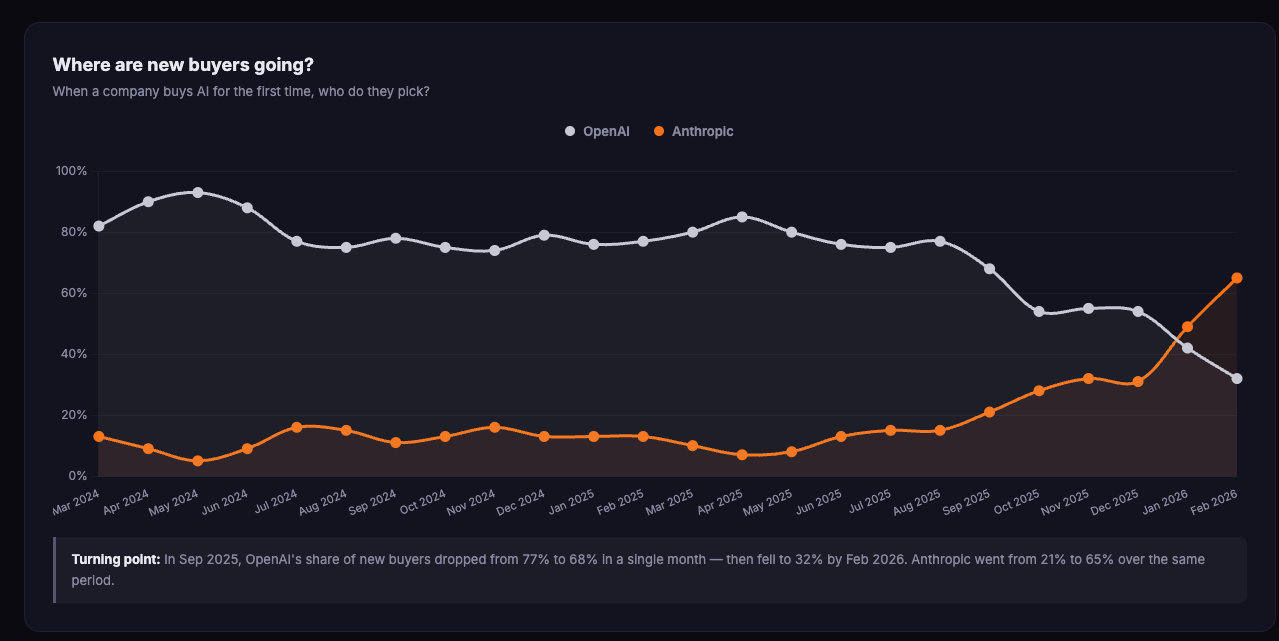 From August 2025, OpenAI dropped from 77% to 68% in a single month. Then it falls off a cliff, 68% to 32% in five months. While the new buyers of Anthropic AI go from 21% to 65% in the same window.