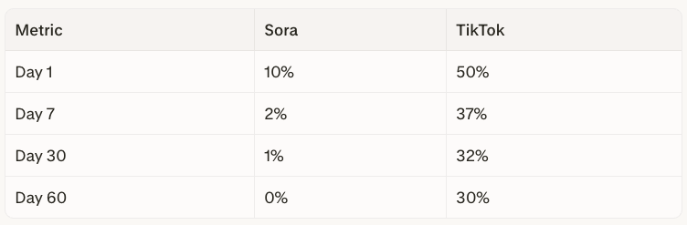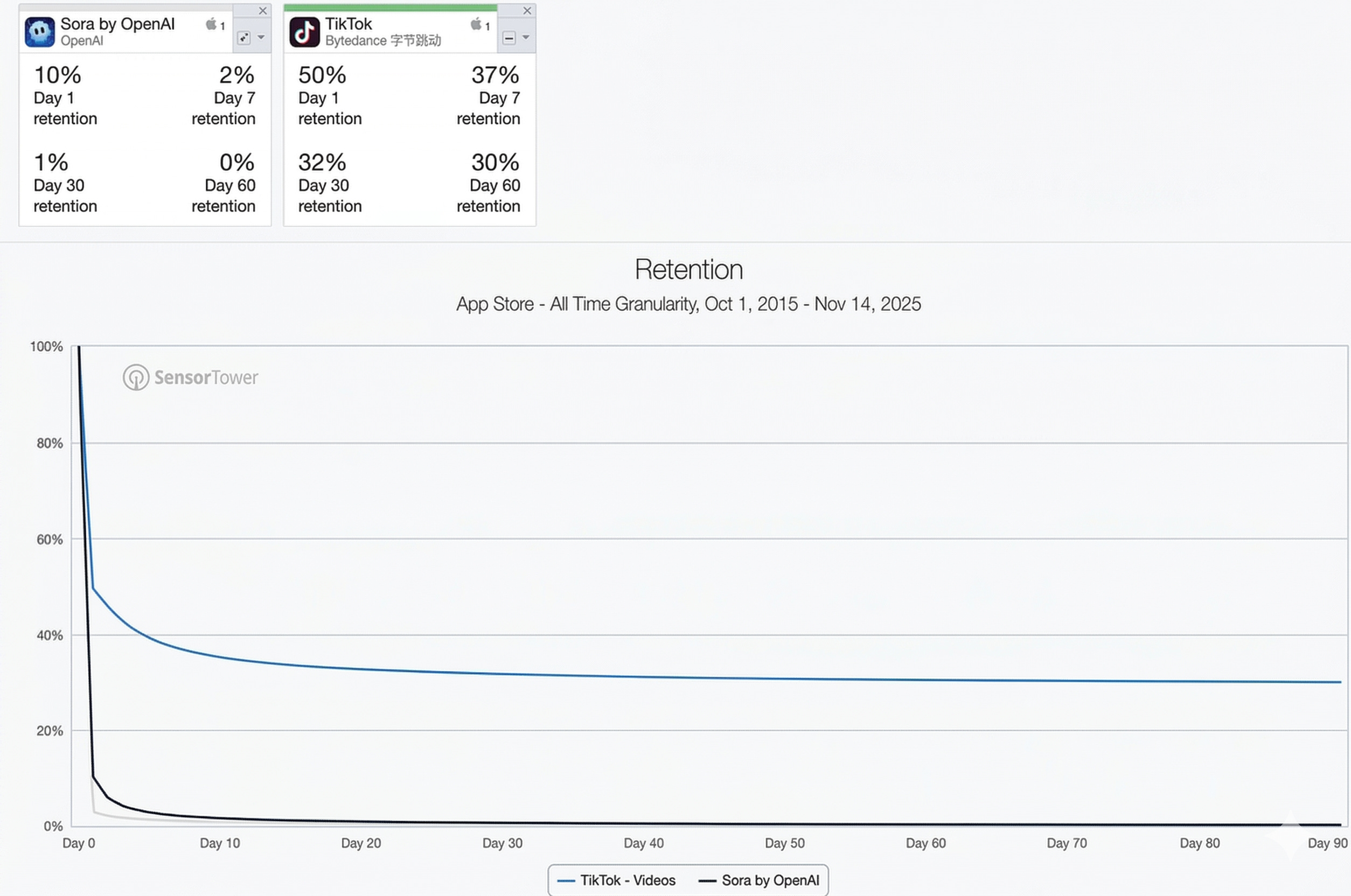 TikTok is a mature app. The fact that a brand-new product from the most hyped AI company on Earth couldn't hold ten percent of users past Day 1 says everything. You have ten million people downloaded Sora, and ninety-nine percent are gone within a month. It’s also a record on its own.
