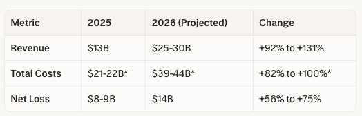 In 2025, OpenAI made around $13 billion in revenue, and they also lost roughly $9 billion in the same year. And their own internal projections show 2026 losses hitting $14 billion. Here’s a table of a quick estimation of their net loss in 2025/26.