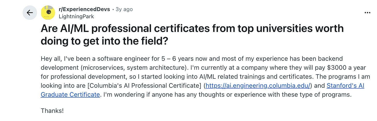 Then you open LinkedIn. Someone else has three certifications. Another person has the Stanford certificate and completed Google’s AI course. The certainty you just bought deflates.