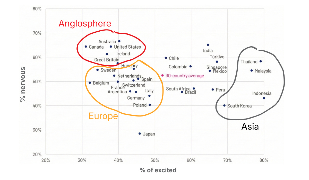 If you’re reading this from the Anglosphere, like the US, UK, or Canada, you’re sitting in the global epicenter of AI anxiety. You are likely feeling much more nervous than excited about AI. Meanwhile, Indonesia and Thailand sit in the opposite corner: near 80% excited, about 50% nervous.