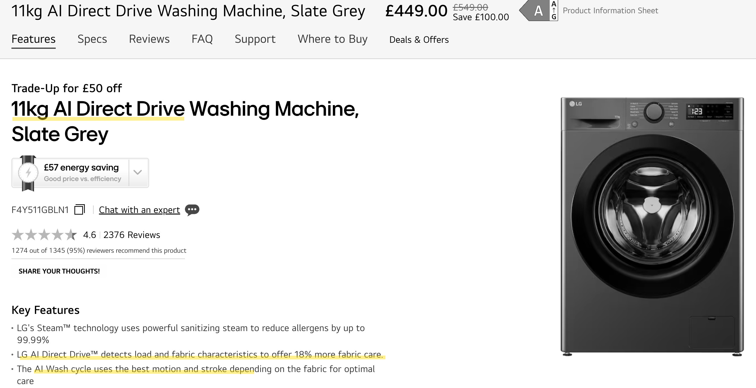 The AI DD™ combines deep learning technology with 7 Motion Direct Drive to analyze fabric types and optimize washing cycles.