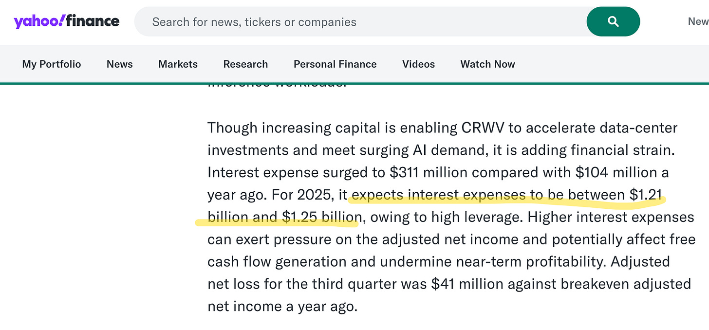 So that’s why you see the gap has to be filled with debt. There’s no other way to fund it. So when you read Coreweave’s balance sheet, don’t think “reckless borrowing.” Think “this is the only way this business can exist.”